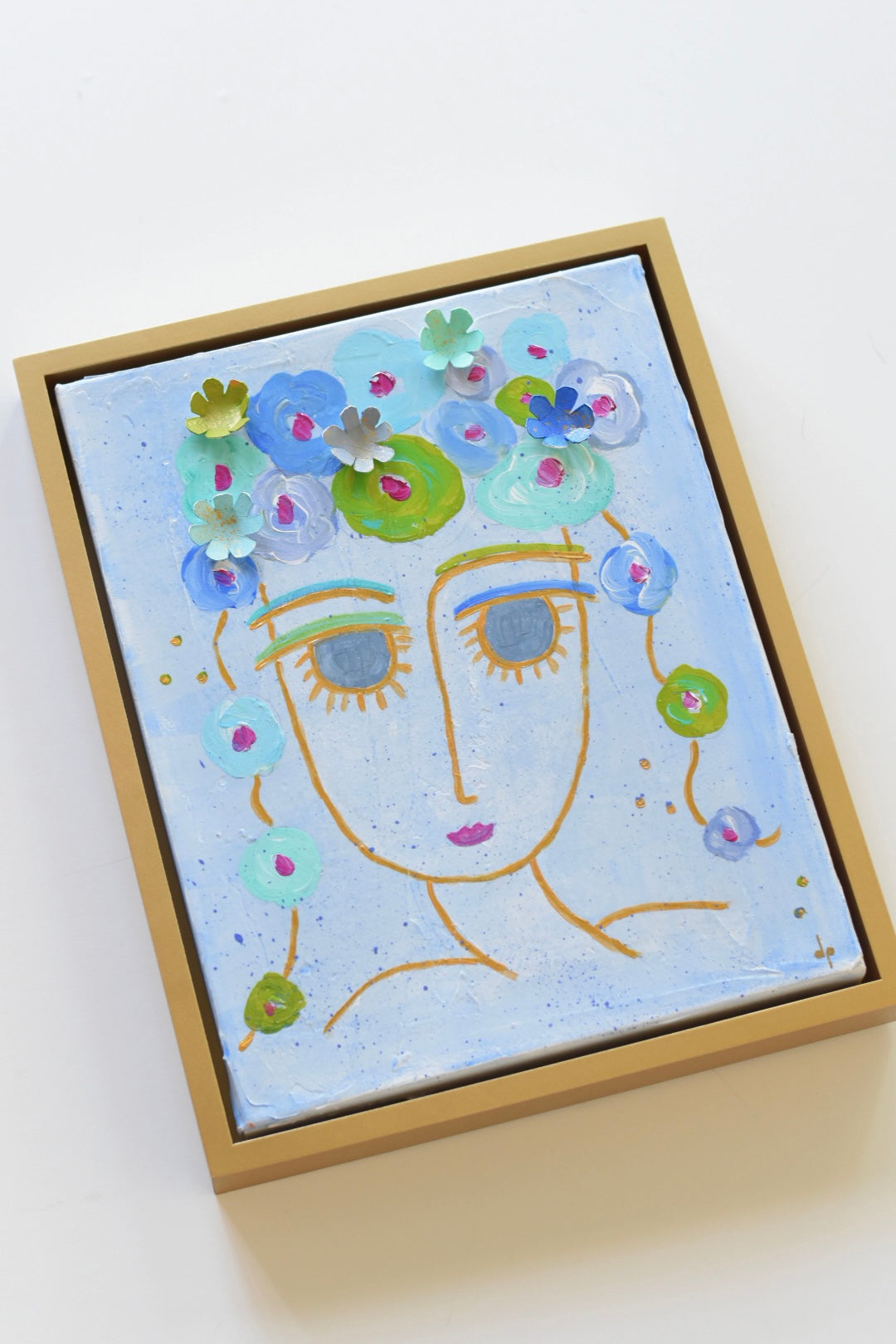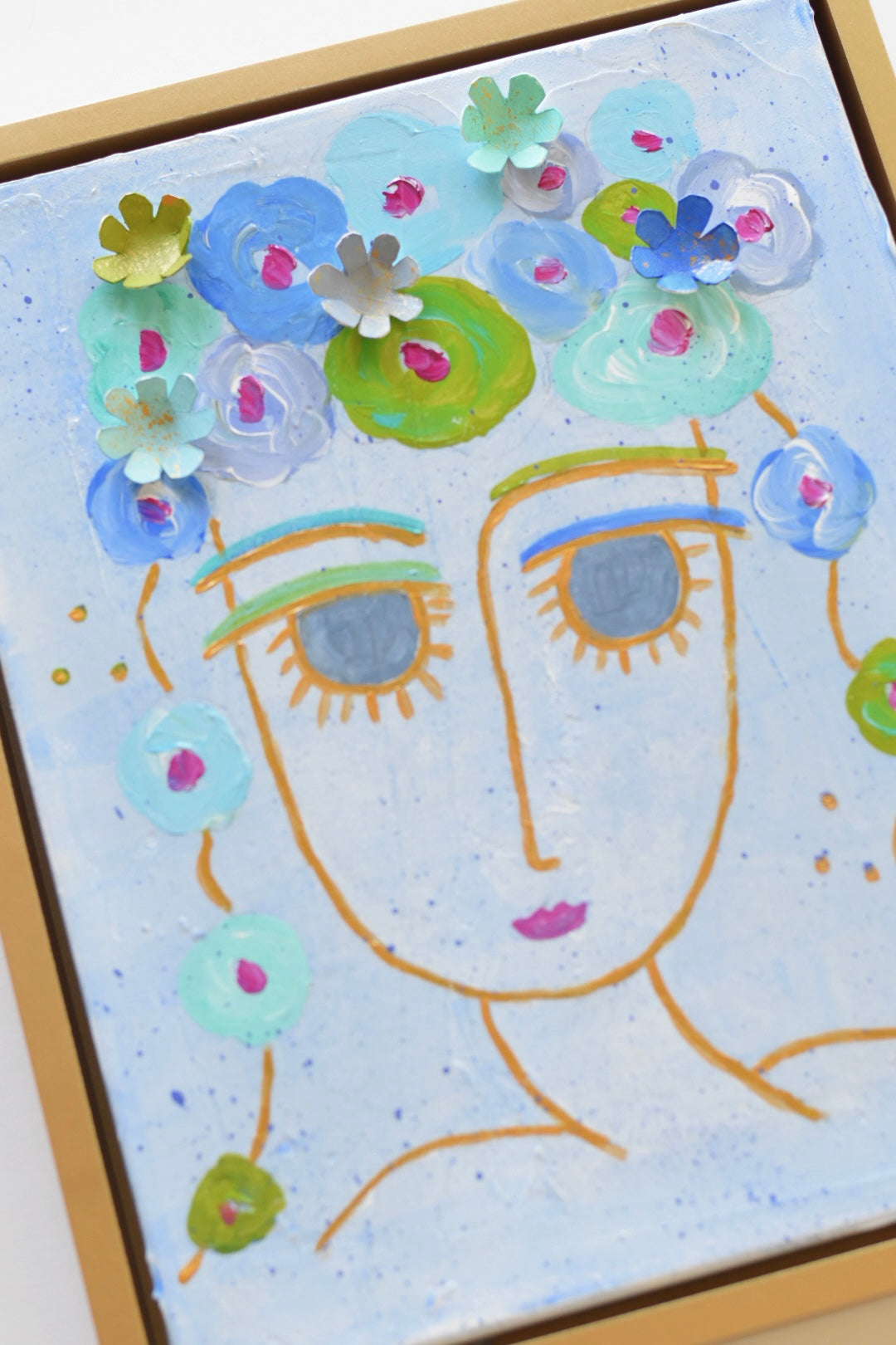 She brings the party. Add a burst of joy and vibrant energy to your space with "Aruba Travel Girlie", an original abstract face painting. This 14"x11" canvas is custom framed in a floating frame that has gold leaf hand applied.  Featuring hand-painted details, this art attached 3D flowers, adding a delightful touch of texture and whimsy.