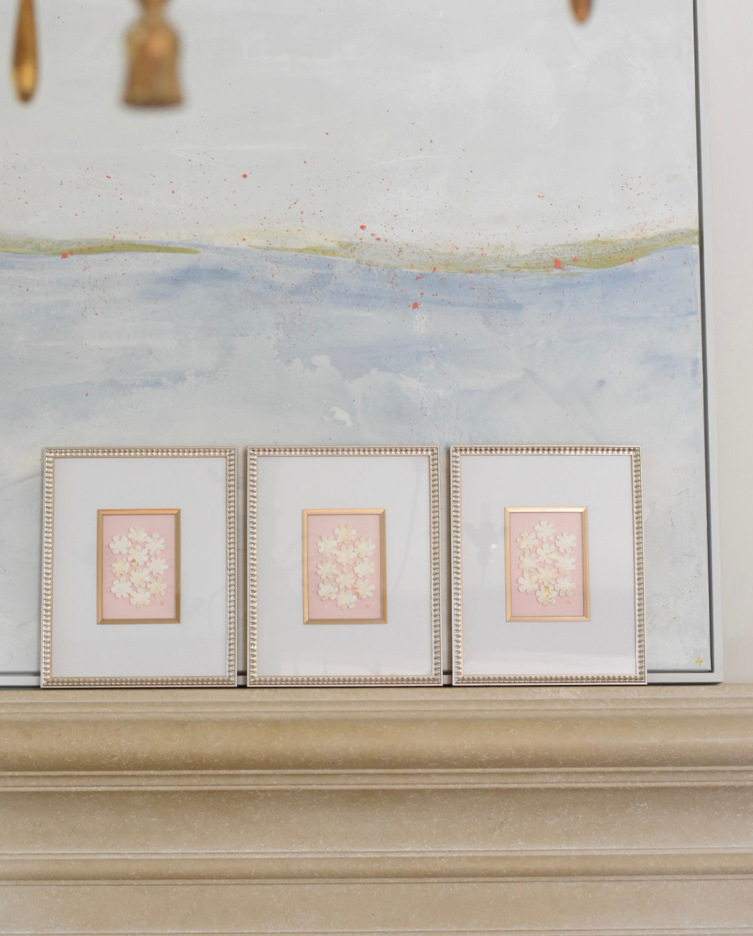 Tiny painted 3D flowers in a champagne/gold 15×12 frame with beveled mat. Each flower is individually cut, shaped, and painted, creating slight variations that make every piece truly one of a kind.
