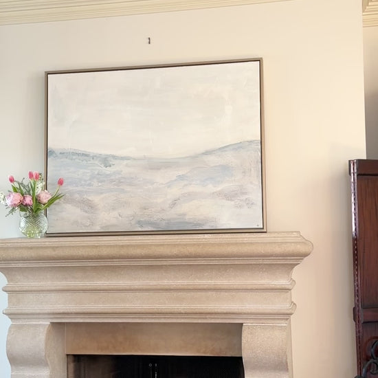 The painting is framed in a custom built floating frame that is 2.5" thick. The frame size adds 1.5" to the overall size of the piece and is painted muted shimmery champagne. The painting is wired on the back.