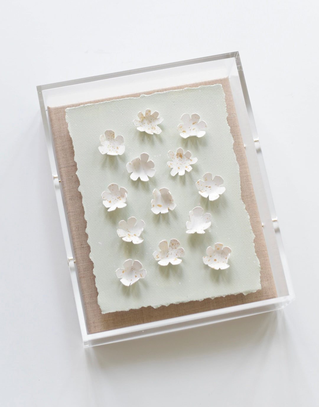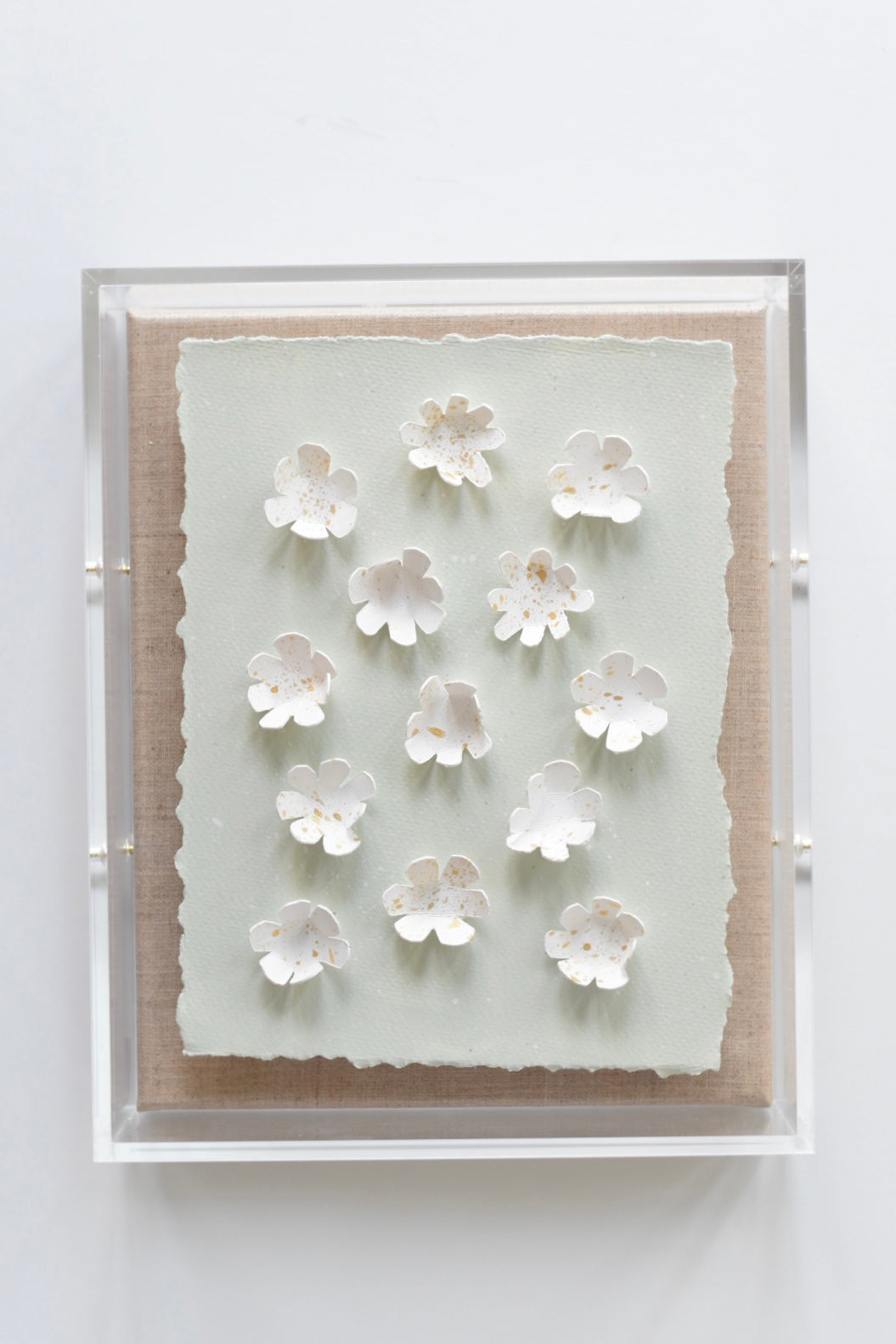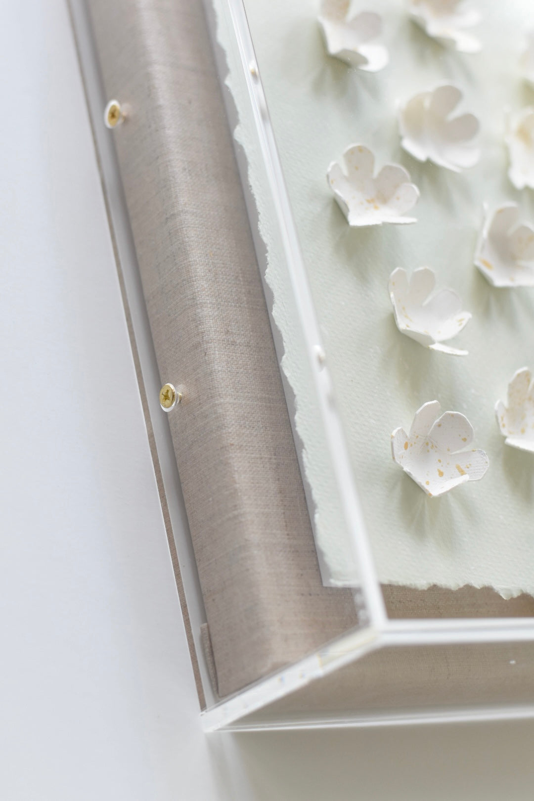Tiny handmade flowers with gold paint speckles framed in a clear acrylic shadowbox frame. Heavyweight archival paper is slightly layered above the linen canvas.