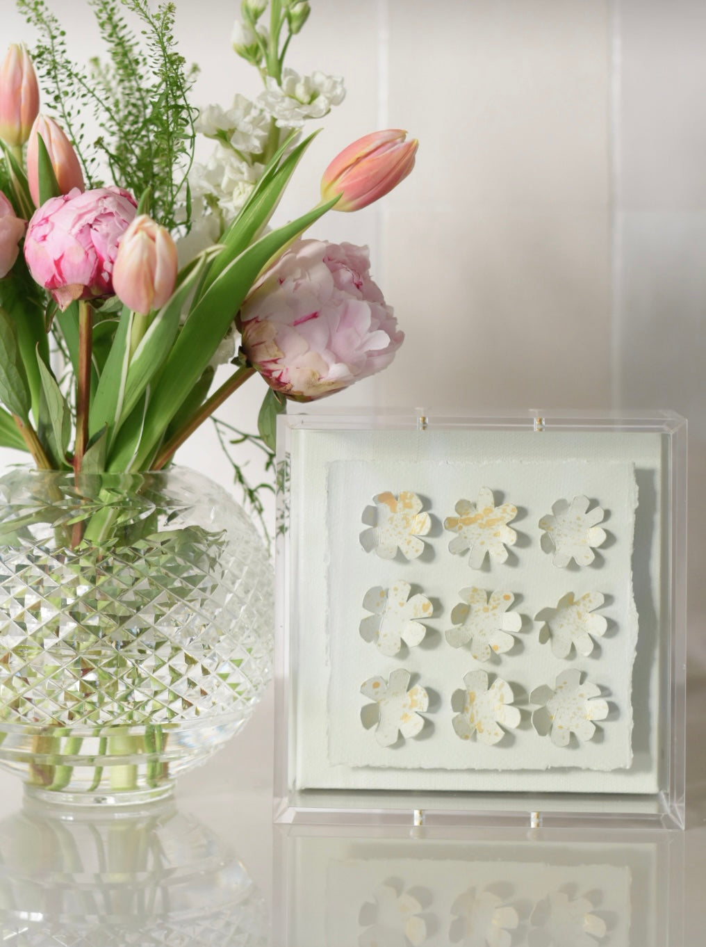• Original 3D paper florals displayed inside a crystal-clear acrylic shadow box