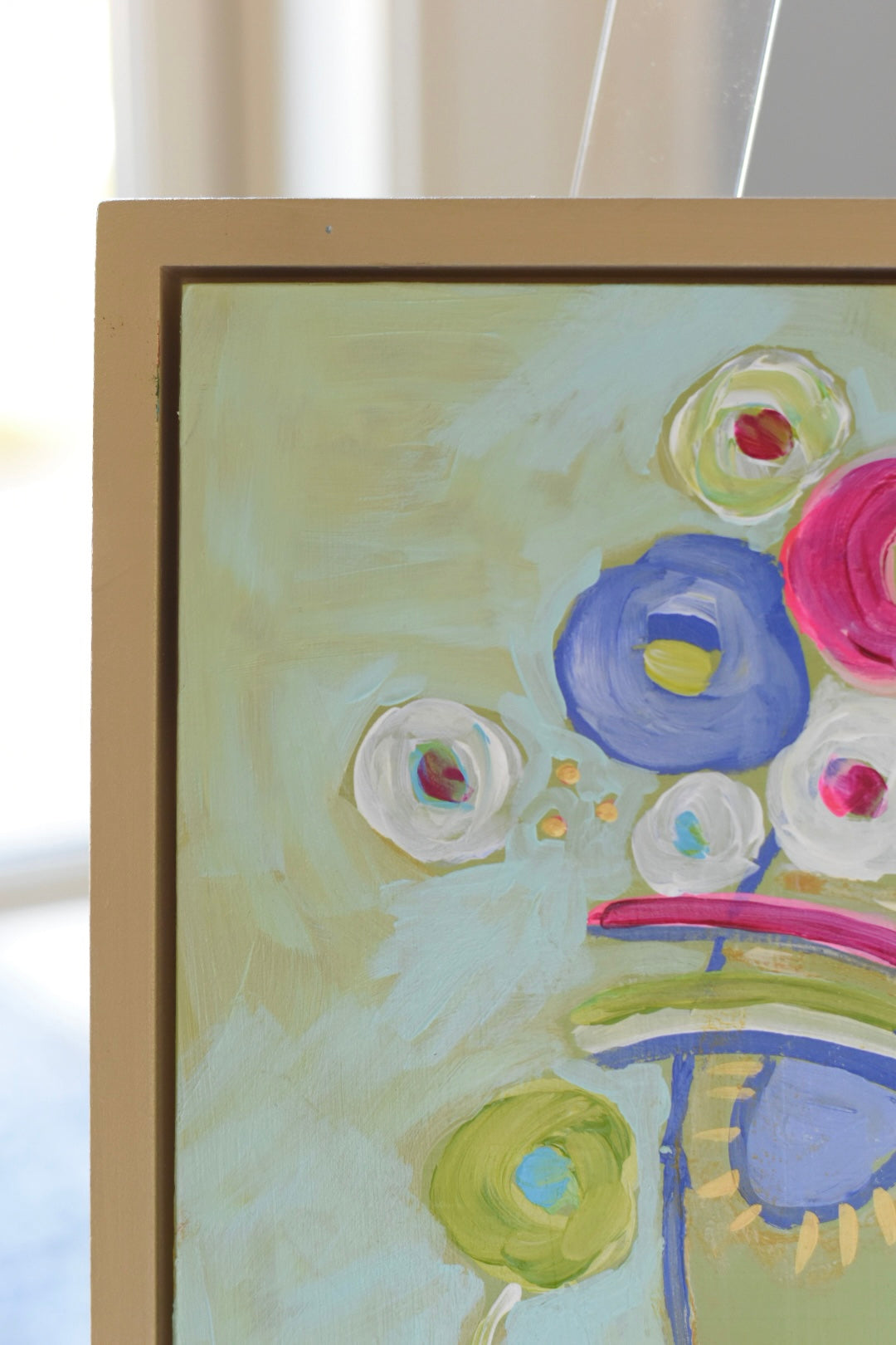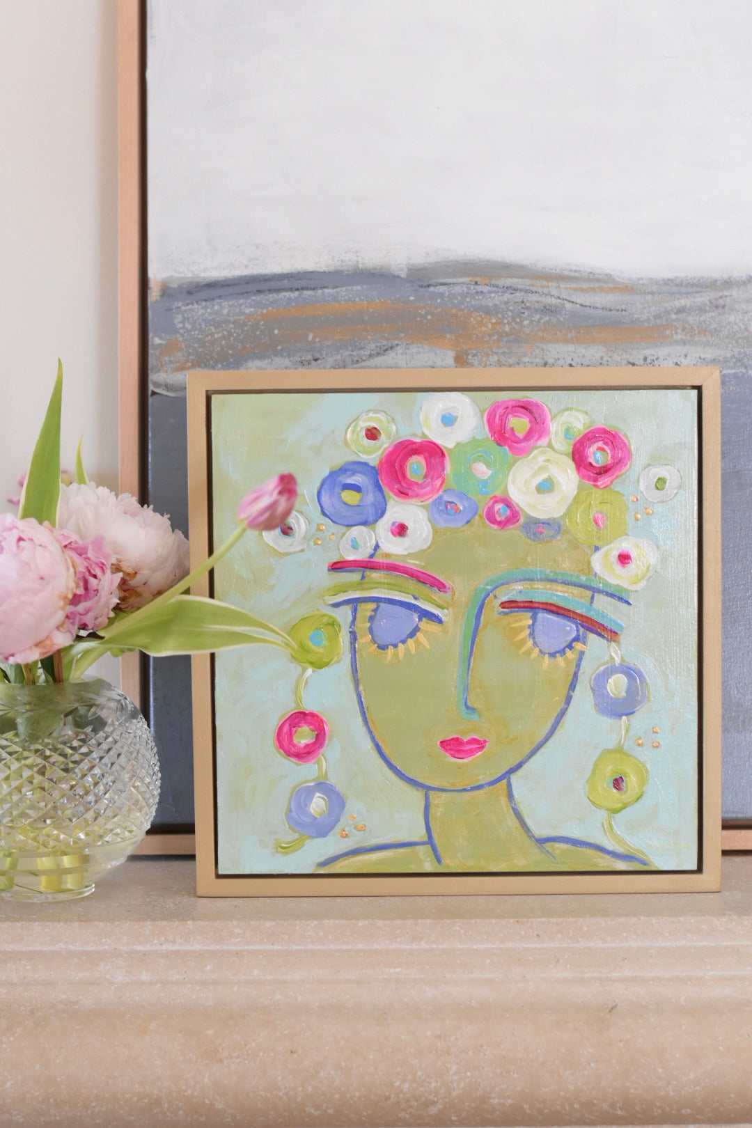 She brings the party. Add a burst of joy and vibrant energy to your space with this fun, original abstract face painting. This 12"x12" panel is custom framed in a floating frame.  Featuring hand-painted details, this art will add a delightful touch of texture and whimsy to your space.