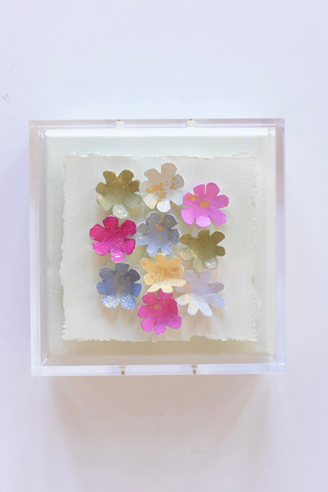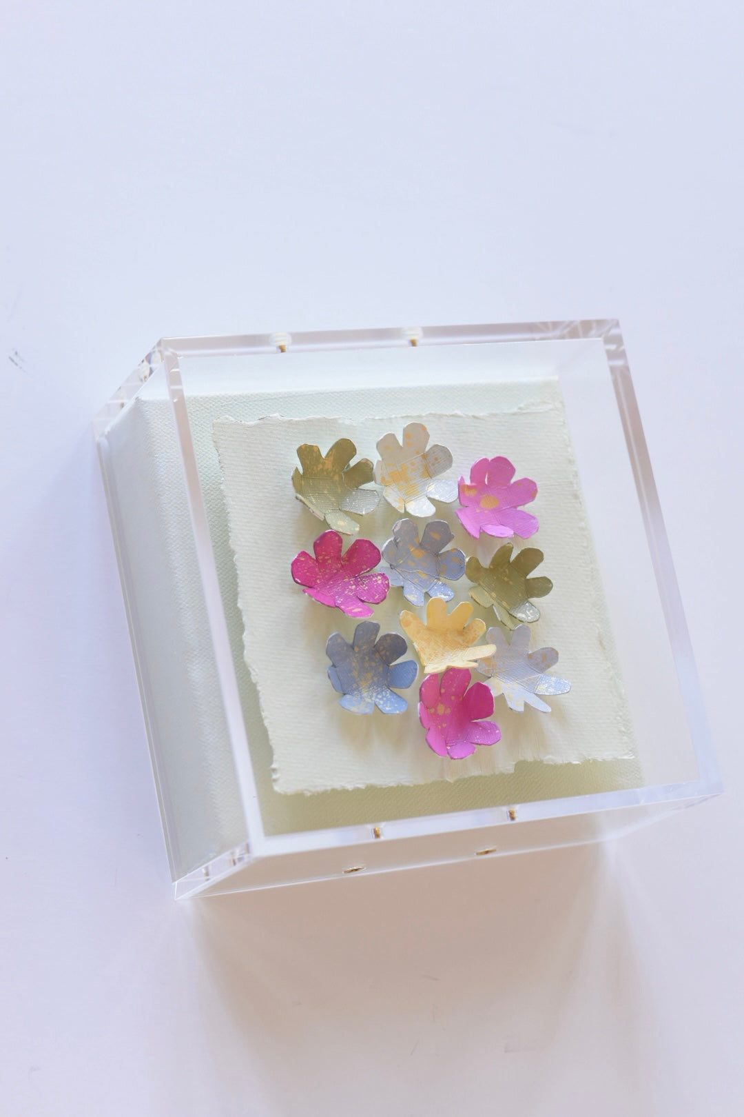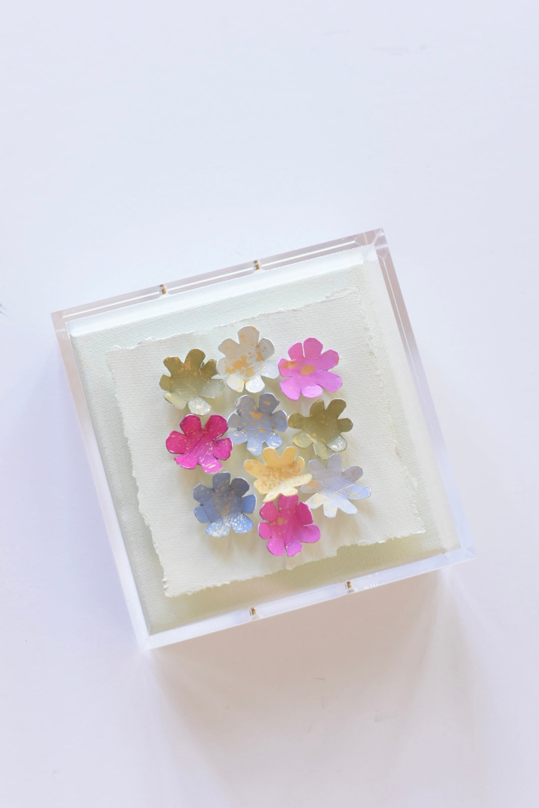 Tiny handmade flowers with gold paint speckles framed in a clear acrylic shadowbox frame. Heavyweight archival paper is slightly layered above the canvas.