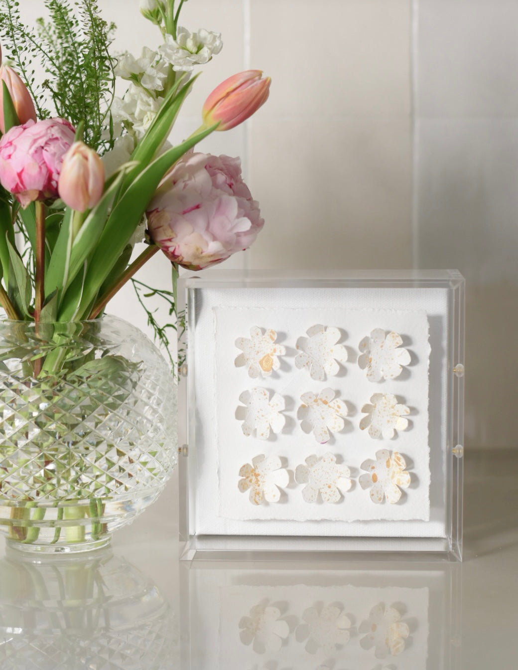 • Original 3D paper florals displayed inside a crystal-clear acrylic shadow box